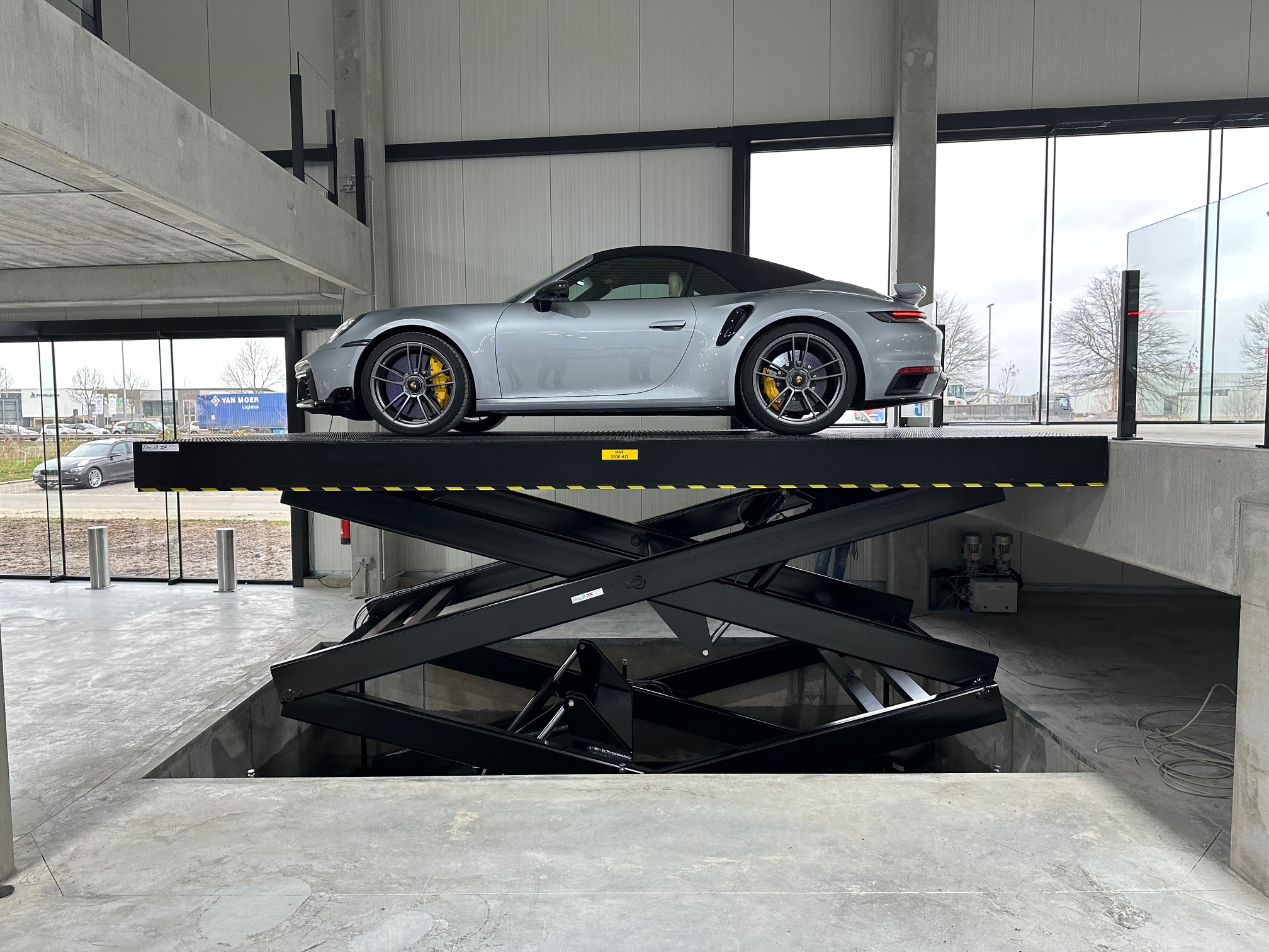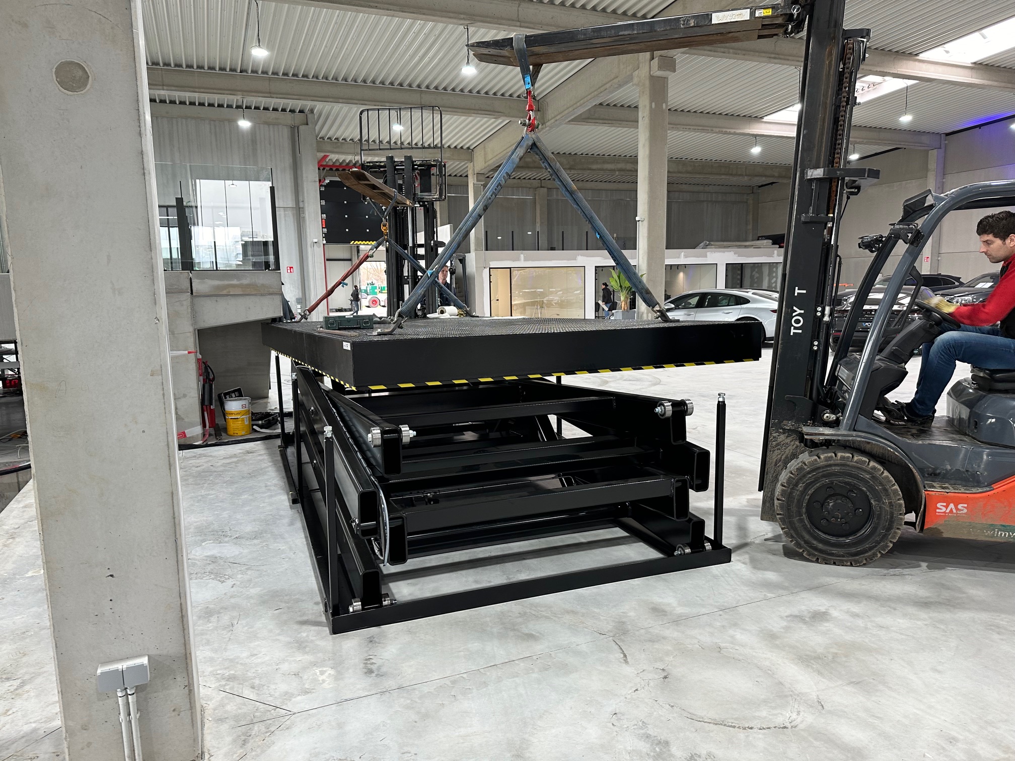 Van V-motors in België kregen we het verzoek om een mooie autolift te leveren om voertuigen naar de verdiepingsvloer te brengen. Deze uitdaging gaan we uiteraard graag aan. Ondanks dat de kraanauto niet onder de overheaddeur paste, is het ons team toch gelukt om de autolift met een eigen gewicht van 5 ton op de juiste plek te installeren. V-Motors zag gelijk dat het goed was, en vertrouwde de eerste hefslag van de lift meteen toe aan een Porsche Cabrio.